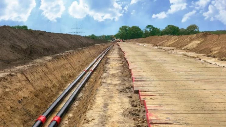 The new high-voltage line, an approximately seven-kilometer-long underground cable, is protected by the egeplast Power Protect cable protection pipe system, which was partially installed using horizontal directional drilling and plowing methods.