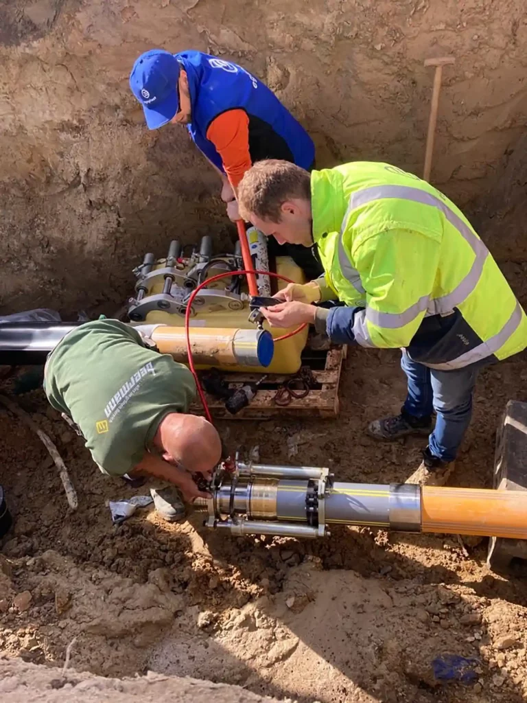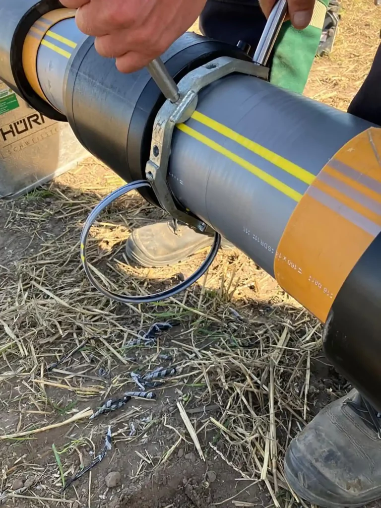 Als Herausforderung gilt es zu erwähnen, dass sämtliche Arbeiten erst nach dem Abernten landwirtschaftlich genutzter Flächen stattfinden können. Auch die Verbindungen in den Zwischenbaugruben waren komplex, da sich hier die losen Rohrenden gegenüberstehen. In diesem Fall wurde die Verbindung mit Pressverbindern aus dem egeplast HexelOne® System und entsprechendem Hydraulik-Spezial-Presswerkzeug problemlos hergestellt.